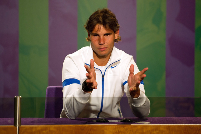 WIMBLEDON, ENGLAND - JUNE 19: Rafael Nadal of Spain talks to the media at the All England Lawn Tennis and Croquet Club ahead of the Wimbledon Lawn Tennis Championships on June 19, 2011 in London, England. The Championships, which are celebrating their 125th anniversary this year begin on June 20, 2011. (Photo by Tom Lovelock - Pool/Getty Images)